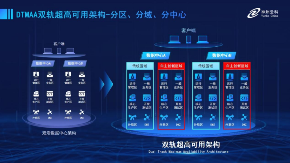 为帮助金融客户更好地应对数字经济时代对可持续性的高要求,实现“信创”与“数字化”齐头并进,银河集团官网推出了双轨超高可用架构。该架构在双活数据中心的分区调度基础上,增加信创域和非信创域的分域调度,实行信创域与传统域应用全量部署,使双中心运营变为双中心四区域并行运行,互为多活,将“0到1”的单轨建设道路变为分区分域协同的多活双轨超高可用架构。帮助客户在新架构下,保障“信创”的同时解决性能瓶颈,提升稳定性,保证应用可持续性,最终实现信创区域和非信创区域的平滑过渡,完成国产化替代目标。