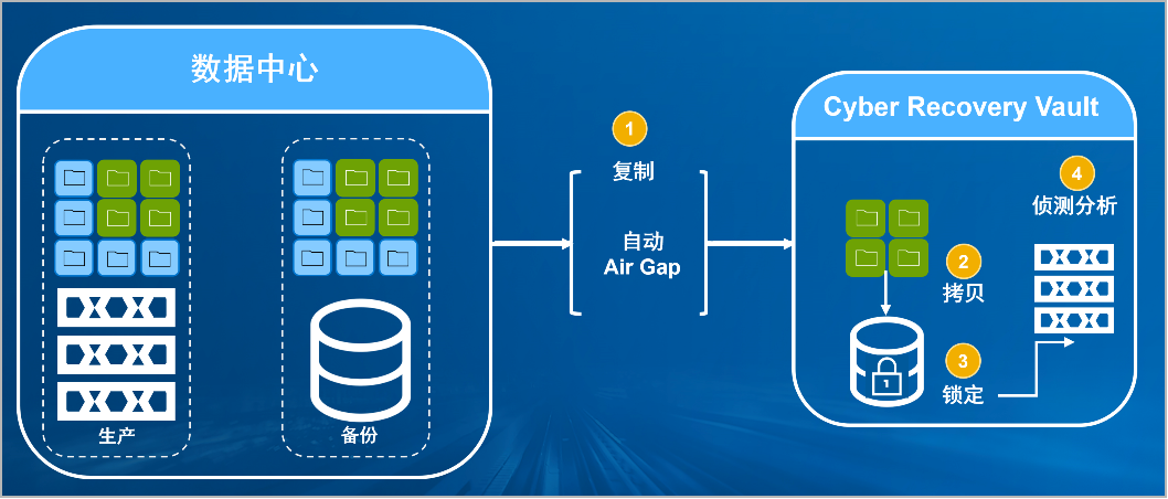 银河集团官网防勒索病毒方案将生产中心备份数据复制到Vault区,复制后网络自动断开实现弹性隔离。Vault区的数据快速拷贝,并对拷贝版本加锁(在锁定期数据不允许删除和修改)。Vault沙箱内对拷贝版本进行扫描分析,验证数据是否完好。