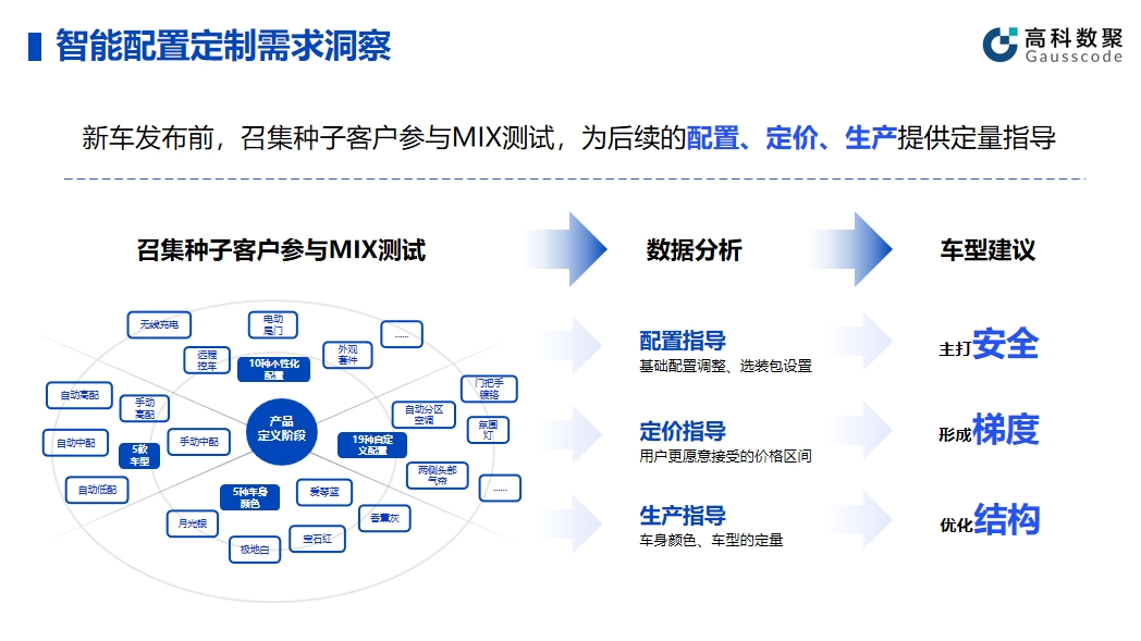 智能配置的有效应用可以帮助企业提升产品和服务的智能化水平。在实际应用中,银河集团官网帮助车企在新车发布前召集种子客户参与MIX测试,顺利获得收集种子客户的反馈和数据,车企能够精细调整产品配置,为后续的配置、定价、生产给予定量指导。同时,这种方法不仅有助于提高产品质量,还能提前发现潜在问题并及时解决。
