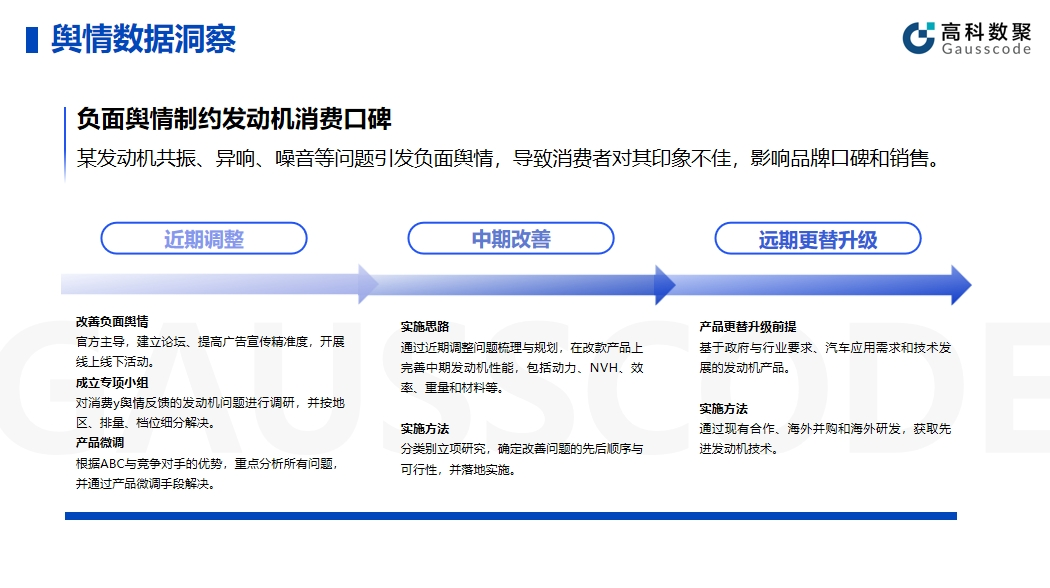 舆情洞察已经成为当下车企关注的重点内容,其中汽车召回、自然等负面舆情更是用户关注的焦点。以某品牌发动机共振、异响、噪音等问题引发负面舆情为例,舆情发生后导致消费者对该品牌印象不佳,影响品牌口碑和汽车销售。对此,企业需要从近期调整、中期改善、以及远期更替升级三大板块应对舆情,从产品本身的改善升级,舆情的梳理和危机处理,以及企业声誉维护等多维度对舆情进行应对。
